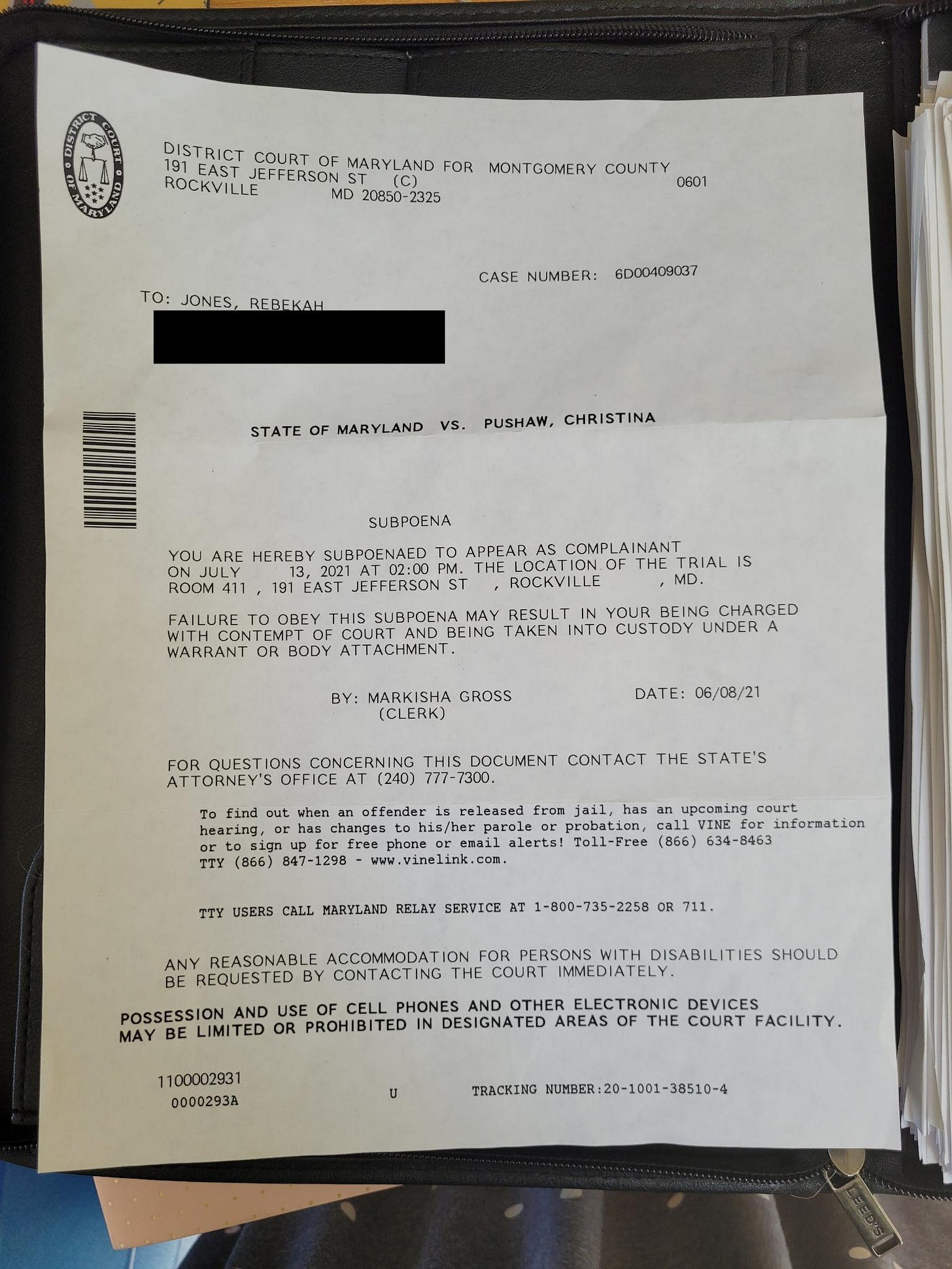 Public records indicate that Christina Pushaw was issued a criminal summons issued on June 8th, and her lawyer Diamonte accepted service in lieu of a personal appearance, according to a representative of the District Court of Maryland with access to the docket, which the state does not release. I requested a copy of the summons to her and dismissal documents, but the court only accepts written public records requests and only delivers documents via the U.S. postal mail with a self-addressed stamped envelope, so there won’t be anything more to report until next week, at the earliest.