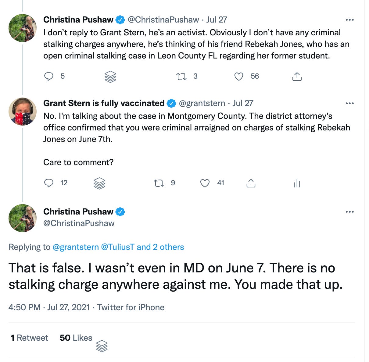 Christina Pushaw is clearly upset by the facts of the case and often tweets vehement denials that she is facing a criminal charge. Often, she points to the court’s denial of Jones’ request for a permanent order against her on April 30th, as if that somehow canceled the criminal proceeding against her.